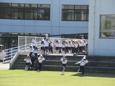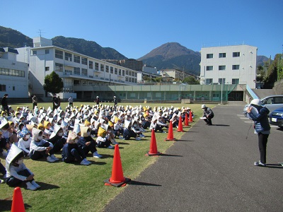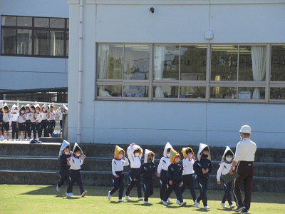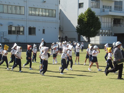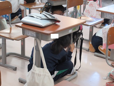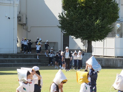 本校では、①市内一斉のサイレンに合わせて、机の下にもぐり、その脚を動かないように手で押さえる。②防災頭巾をかぶり、芝グラウンドへの避難開始。の流れで行いました。